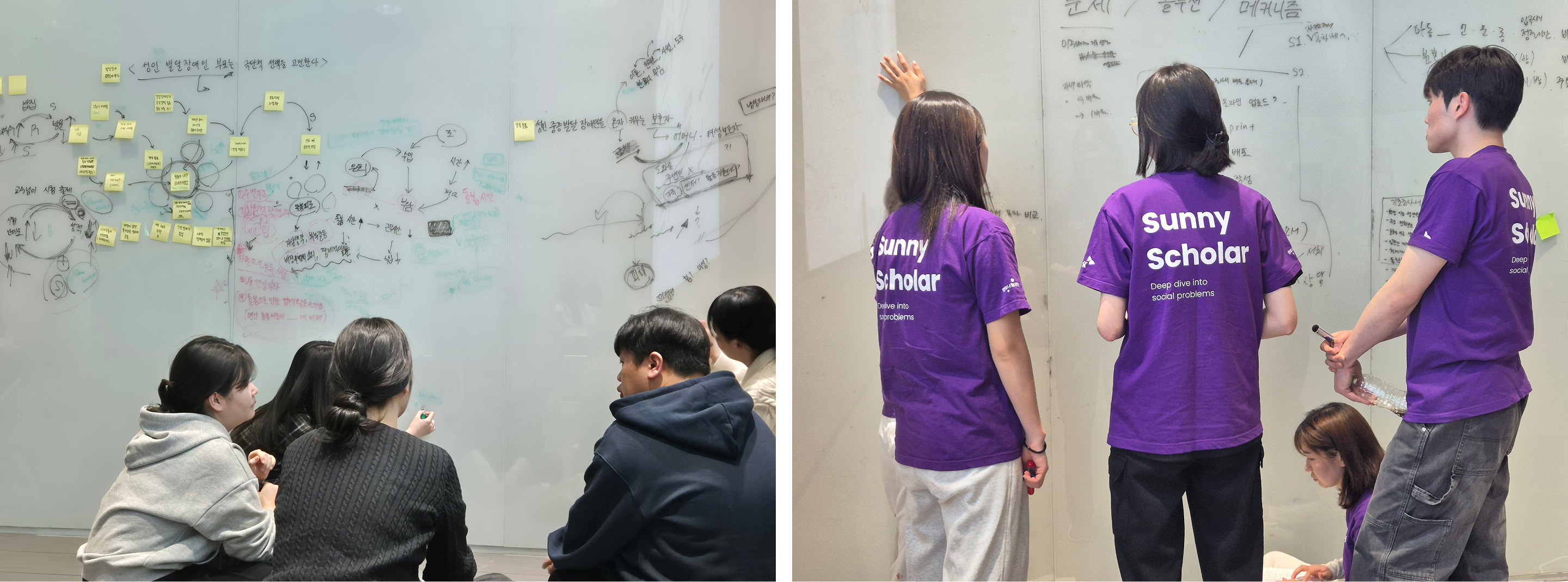 지현 가장 중요한 건 사회문제 정의예요. 보통 대학생들이 참가하는 공모전이나 해커톤 같은 건 대부분 솔루션을 위주로 심사해요. 하지만 Sunny Scholar에서는 주어진 사회문제(장애, 다문화 등)에서 문제를 직접 찾아서 정의하는 것 자체가 하나의 중요한 결과물이에요. 좋은 문제 정의에서 좋은 솔루션이 나온다고 믿기 때문에, 전체 8개월 과정에서 3개월 이상을 여기에 쏟아요.
