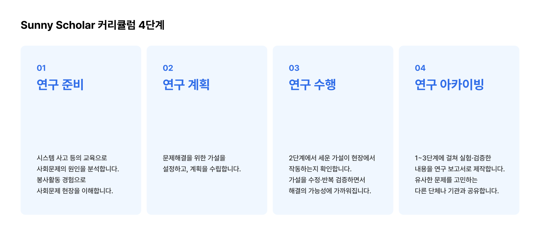 Sunny Scholar의 커리큘럼을 설계하고, 각 단계마다 필요한 지원을 제공하는 팀이에요. Sunny Scholar 4기는 네 명의 매니저가 운영했으며, 오늘 인터뷰에는 혜승·지현·효인이 함께했어요.